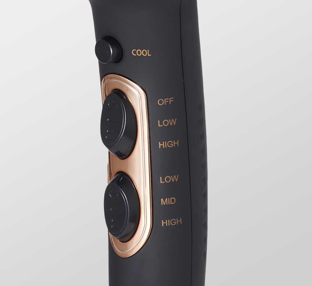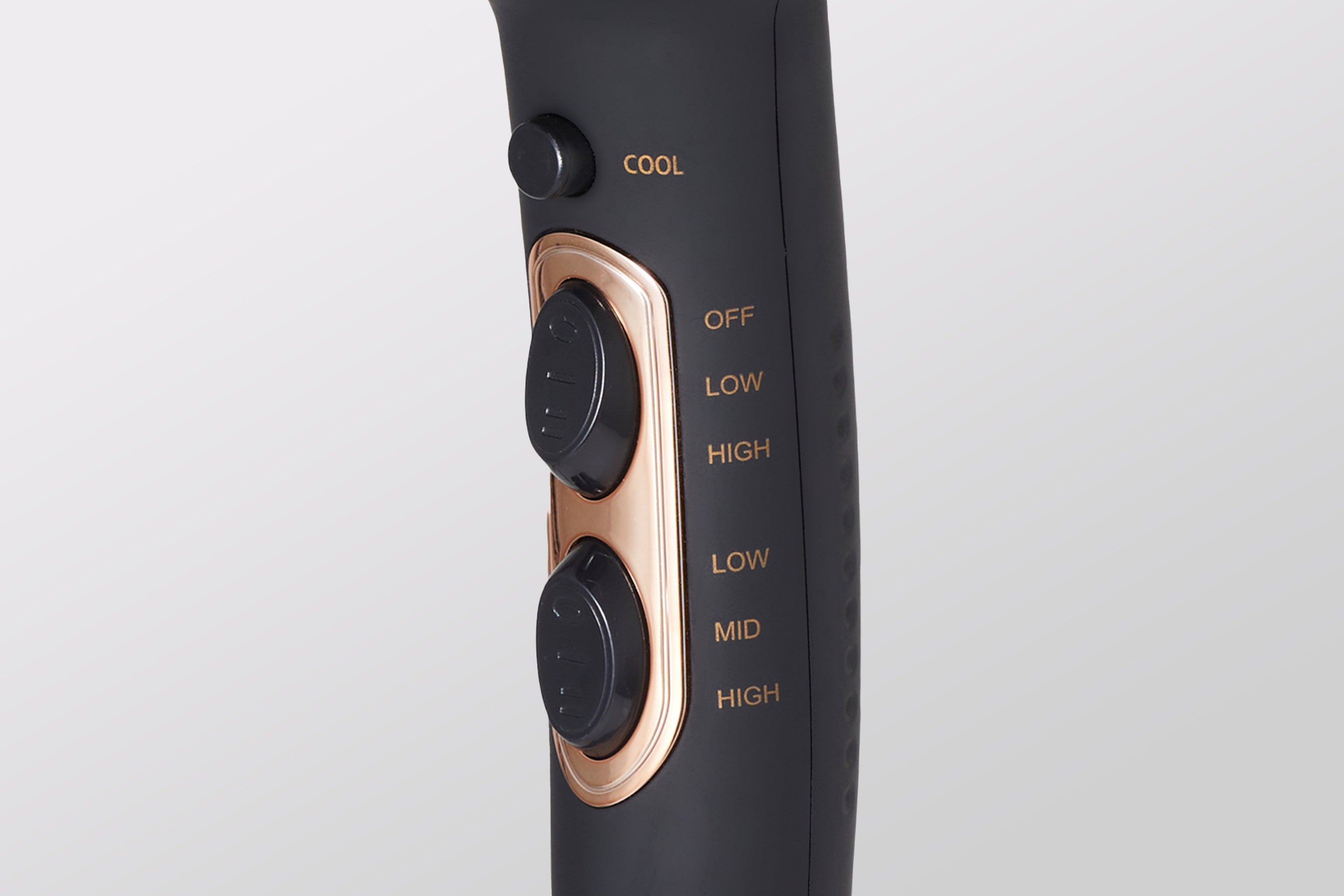 ハンドルについた操作スイッチの「LOW・MID・HIGH」で温度調節を「COOL」ボタンは押してる間だけ冷風が出るシンプルな設計。
